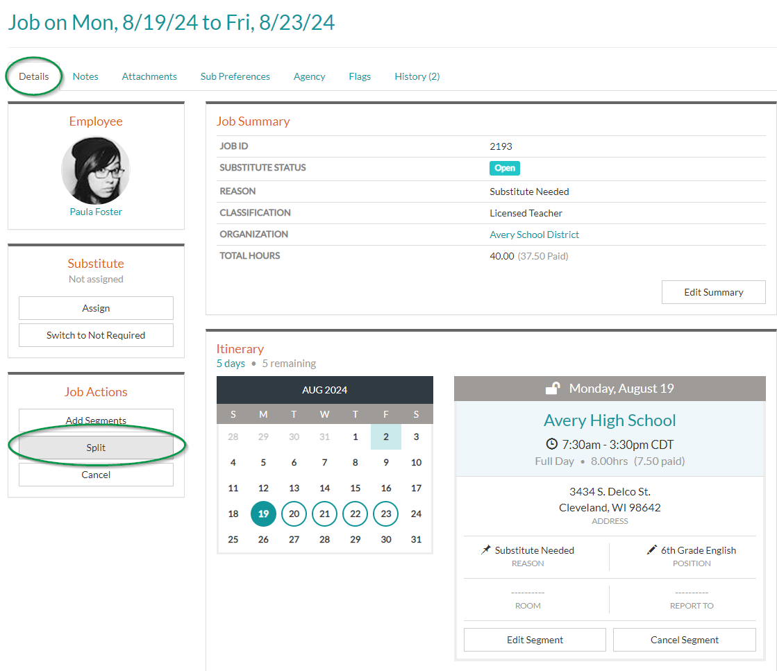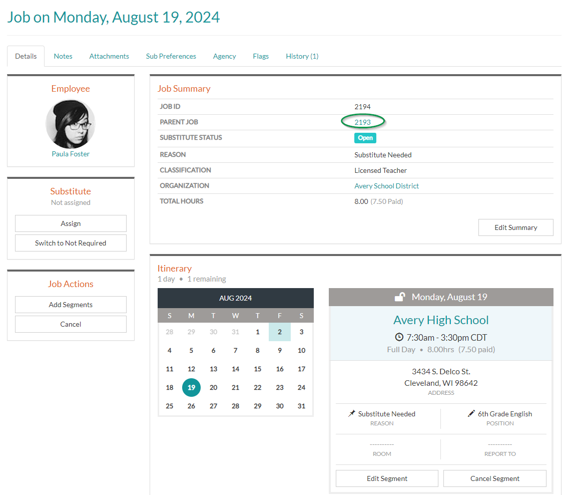 4. From the child job Details page, you can review all information about the job and/or assign a substitute. To access the original job, click the the Parent Job ID link.