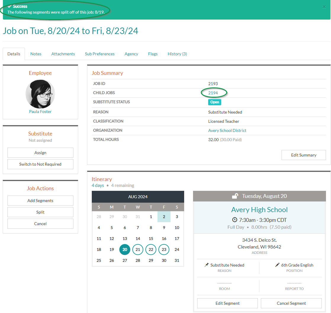 3. Absence & Substitute will create a Child Job with the selected job segments which you can access by clicking the Child Job Id link.